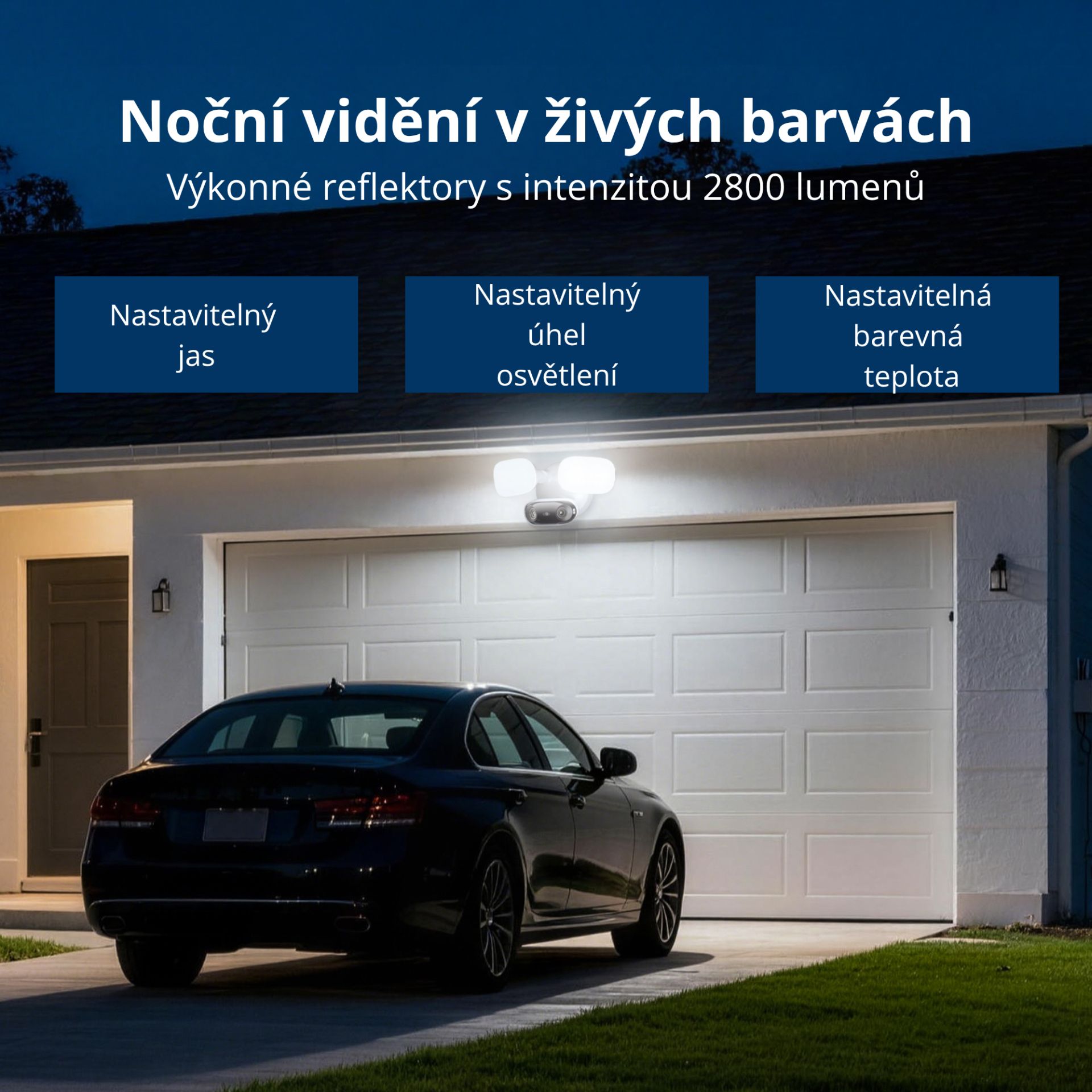 - Dvojité varování: Jakmile je zaznamenán pohyb, okamžitě se aktivují jak výkonné reflektory, tak siréna o hlasitosti 105 dB.