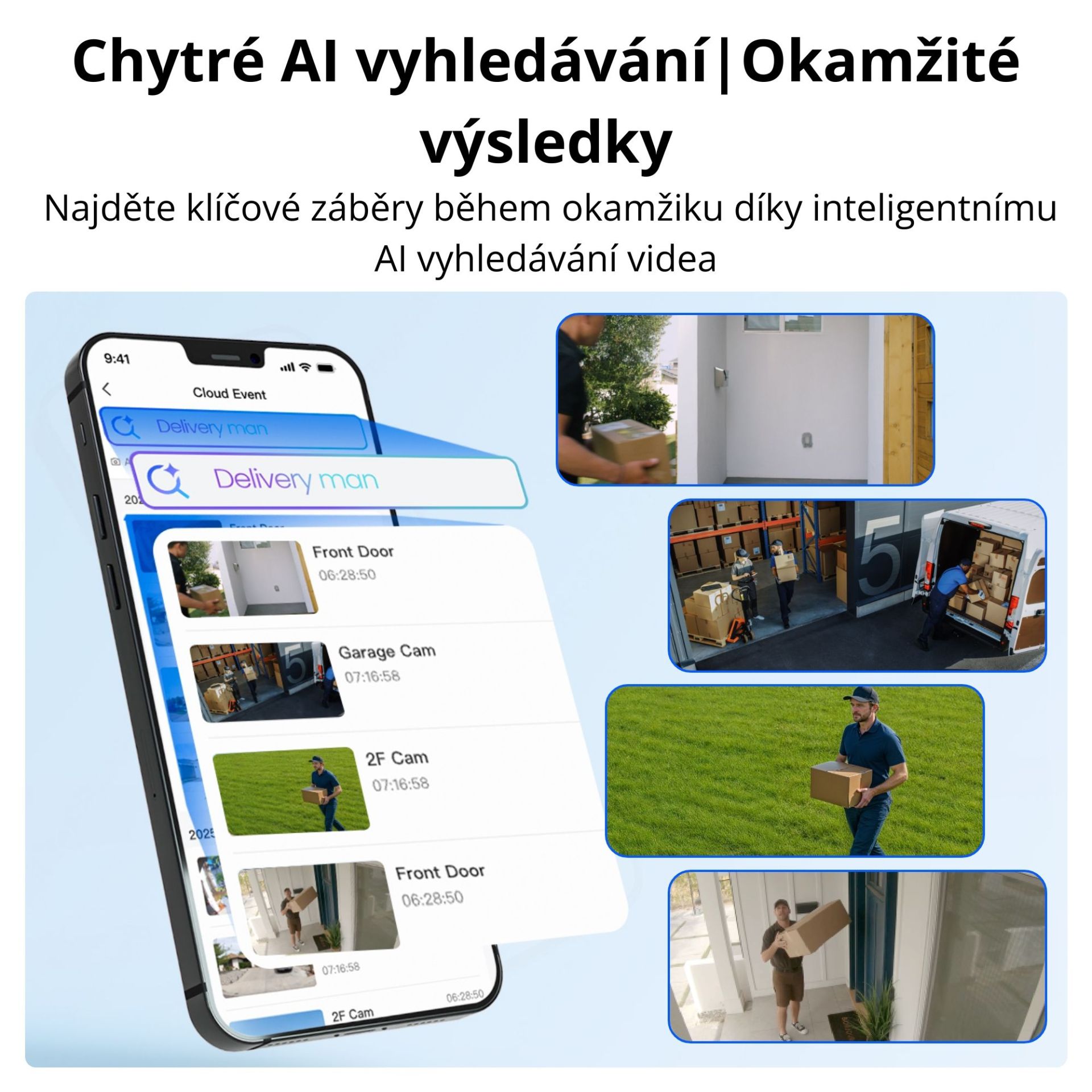 AI Video Search umožňuje snadné a rychlé vyhledávání konkrétních videozáznamů v lokálně uložených spouštěcích nahrávkách. Stačí zadat popisná klíčová slova (např. „osoba v bílém oblečení“, „žlutý pes“) a systém automaticky filtruje irelevantní záznamy, což vám umožní rychle identifikovat cílovou bezpečnostní událost. Tato inteligentní funkce výrazně zefektivňuje hledání a zkracuje čas potřebný k nalezení relevantních videí.