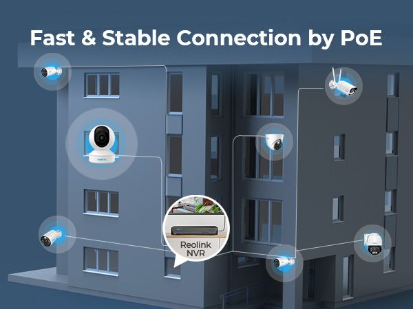 Díky technologii Power over Ethernet (PoE) může každá kamera této sady přenášet videa a současně se nabíjet pouze jedním síťovým kabelem. Získejte stabilní připojení bez složitého zapojování. Proces zapojení už nemůže být pro nadšence/začátečníky jednodušší!