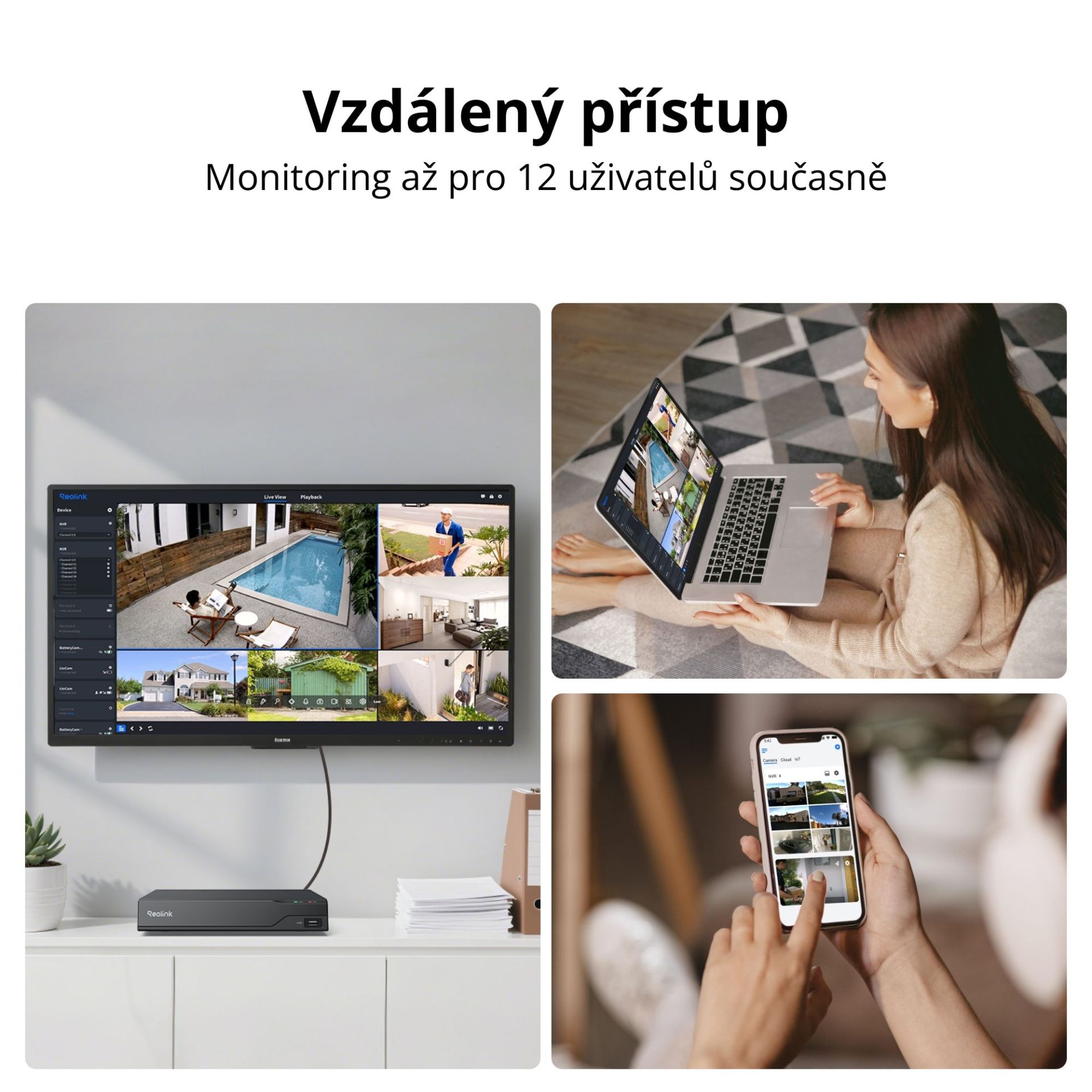 Reolink RP-PN8 podporuje jak lokální, tak vzdálený přístup ke kamerám. Můžete sledovat živé přenosy a spravovat váš systém pomocí monitoru, PC klienta nebo aplikace. S podporou až 12 současných uživatelů (2 hlavní+ 10 vedlejších) může váš tým zůstat propojen kdykoli a kdekoliv.